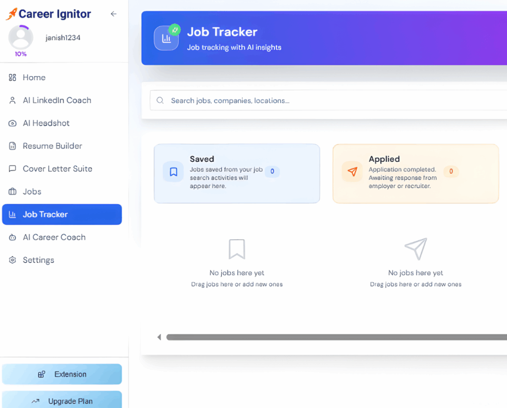 Effortlessly track all your job applications and progress with our intuitive Jobs Tracker. Move opportunities through stages like Saved, Applied, Interview Scheduled, Offer Received, and Hired with a simple drag-and-drop interface. Set reminders for deadlines and follow-ups, ensuring nothing slips through the cracks. Stay organized, focused, and increase your chances of landing your dream job faster.